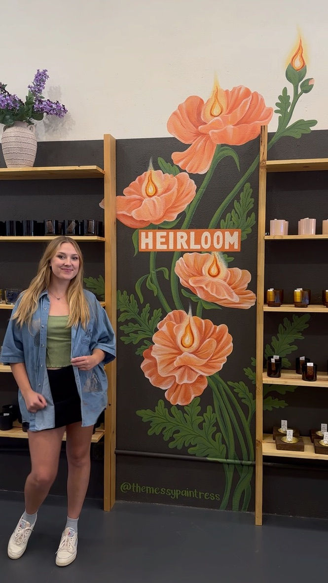 You can find these candle-lit poppies nestled in Heirloom Candle Bar in the Fayetteville Square. Out front, is a faux fireplace, ready for seasonal storefront window switch-ups.